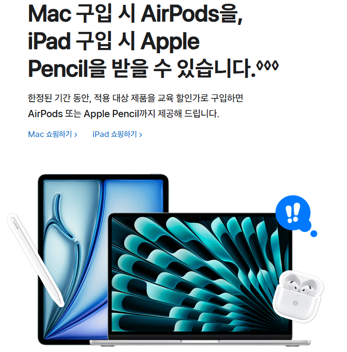 특히, 맥북(MacBook), 아이패드(iPad)와 같은 학습에 필수적인 제품군에 대한 할인과 함께, 에어팟(AirPods) 증정 혜택까지 포함되어 있어 더욱 매력적입니다.