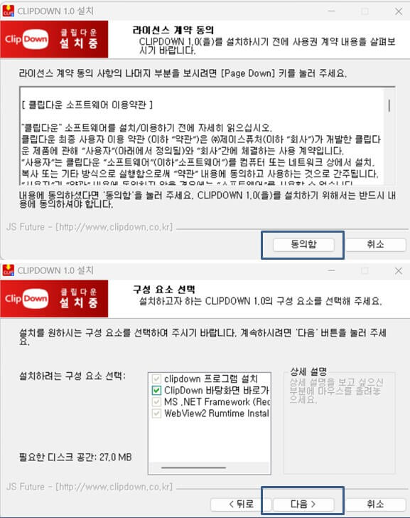 3. 약관을 잘 읽어 보시고, 동의 버튼을 눌러 설치요소와 설치 폴더를 확인한 뒤 다음를 눌러 주세요.