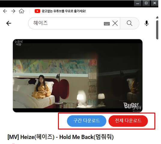 6. 유튜브 영상을 클립다운에서 재생시키면, 영상 재생 화면의 아래쪽에 '구간' or '전체'버튼이 나타납니다. 원하는 버튼을 눌러 설정 화면이 나타나고 여기서 추출이 가능합니다.