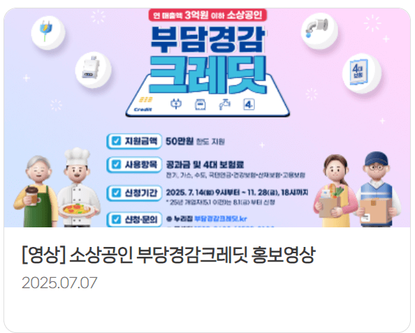 - 지원 내용: 공과금(전기, 도시가스) 및 4대 사회보험료(건강, 국민연금, 고용, 산재) 납부에 사용 가능한 최대 50만원의 크레딧이 지급됩니다.